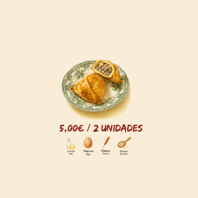Empanada tradicional relleno de carne ternera, horneado hasta lograr una masa crujiente y un relleno jugoso.
