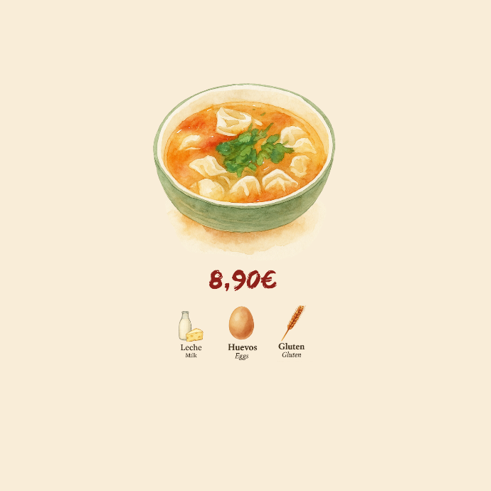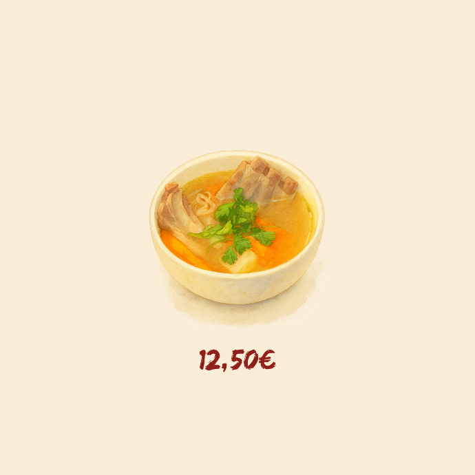 Sopa de cordero, zanahoria, rabo y cilantro fresco. cocida lentamente para obtener un caldo nutritivo y reconfortante. mientras que las verduras aportan un toque dulce y equilibrado. el cilantro añade un aroma fresco que completa el sabor del plato.